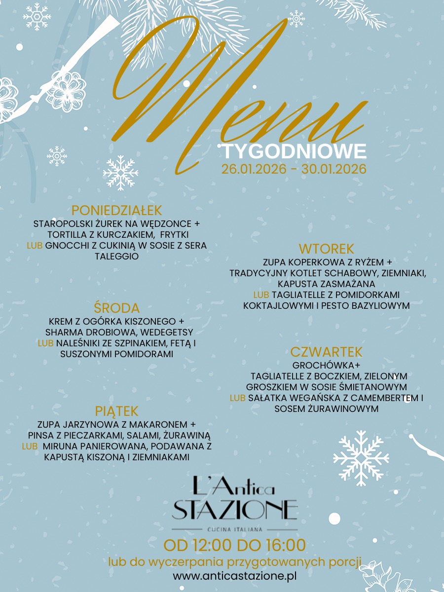 Zapraszamy Was na nasze menu tygodniowe, idealne na zimową przerwę i chwilę prawdziwej przyjemności przy stole.